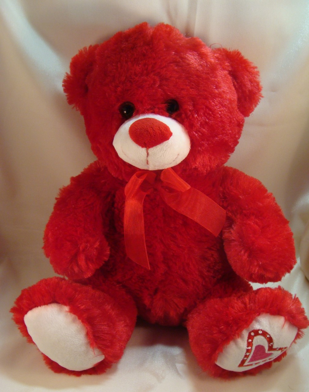 This is a beautiful deep red plush bear! ~ He is 10" high in his sitting position and approximately 10" across at the widest part (includes paws) ~ He has a red velour nose and embroidered hearts on his one paw pad. ~ His paw pads and the white on his nose are created from a velour material & he has a red chiffon bow ~ He is absolutely gorgeous and is in MINT CONDITION!!!