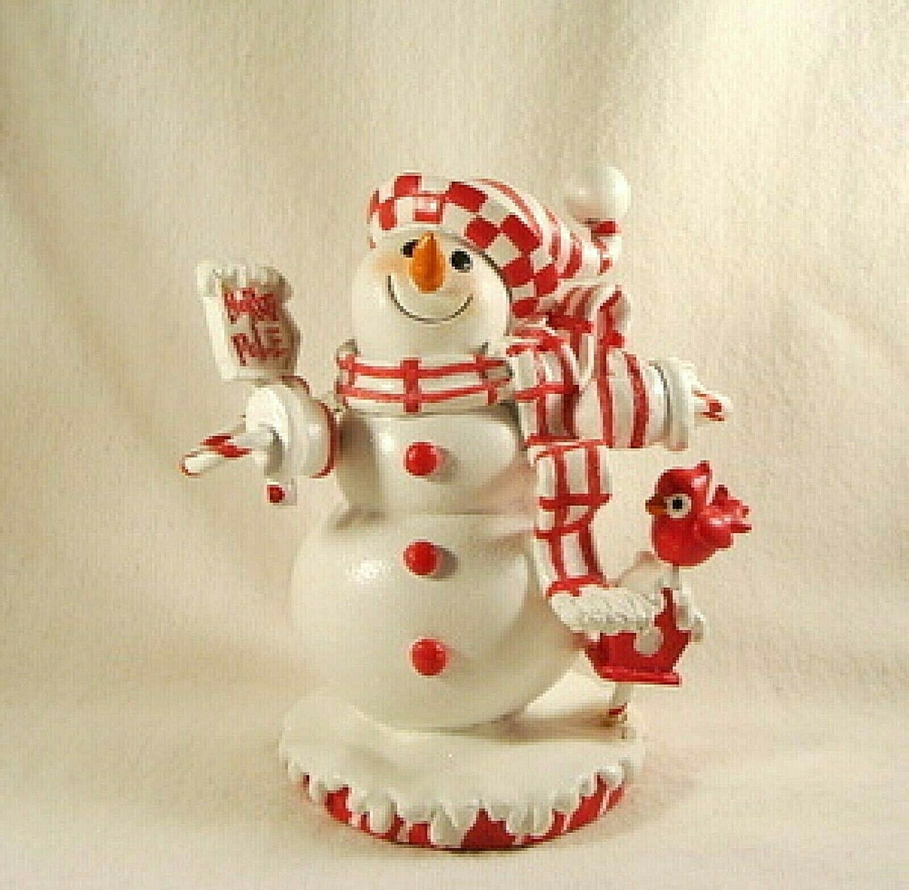 This is Enesco's ~ RED & WHITE SNOWMAN which is Item #484857. ~ He has a birdhouse with a bird in one hand and a sign reading "NORTH POLE" in the other hand. ~ He stands 5" high and has a 3" base. ~~~~~